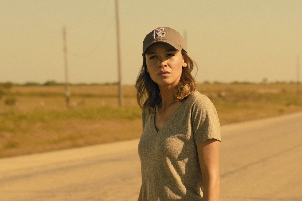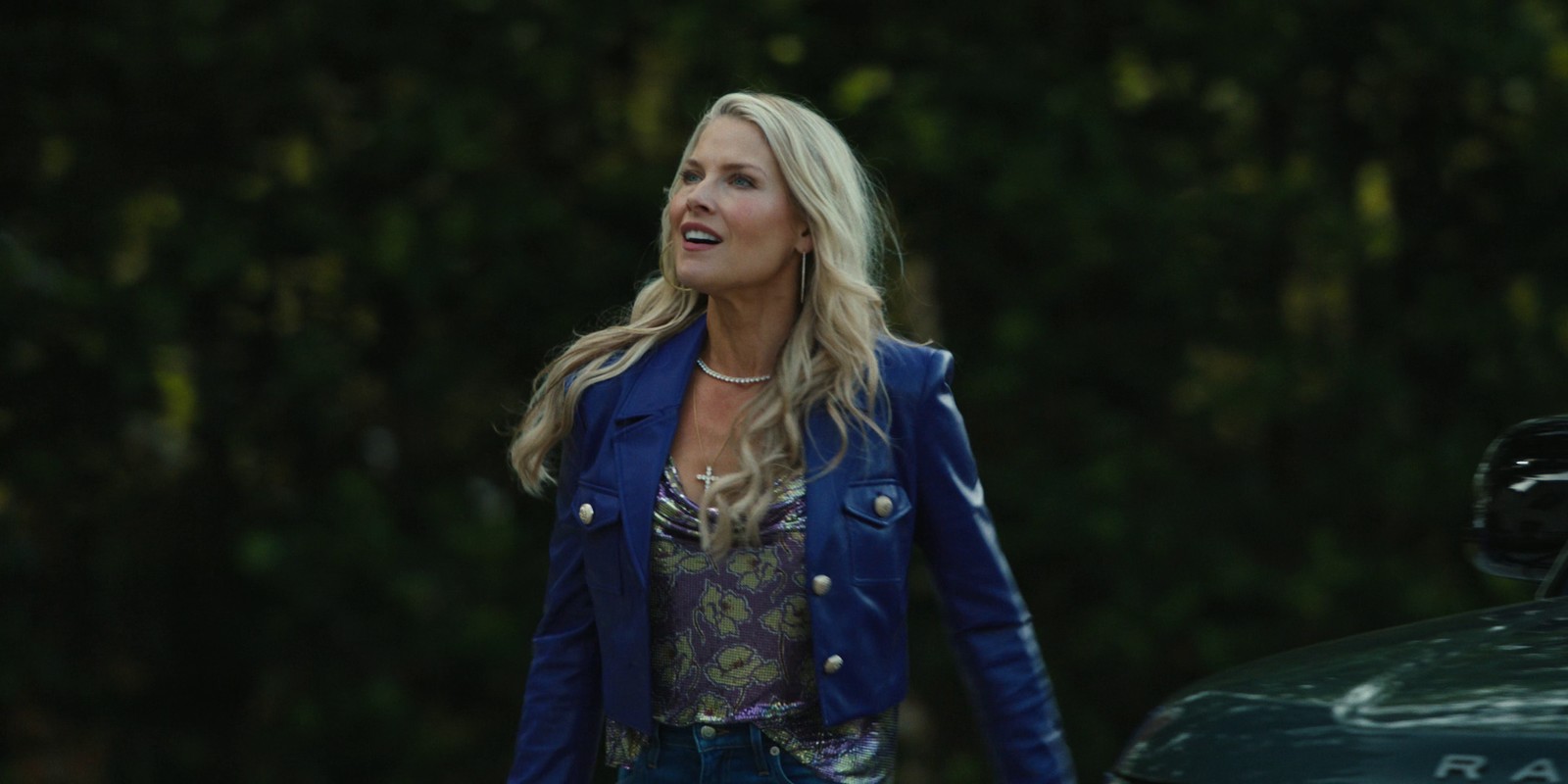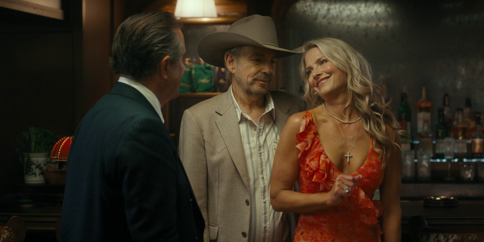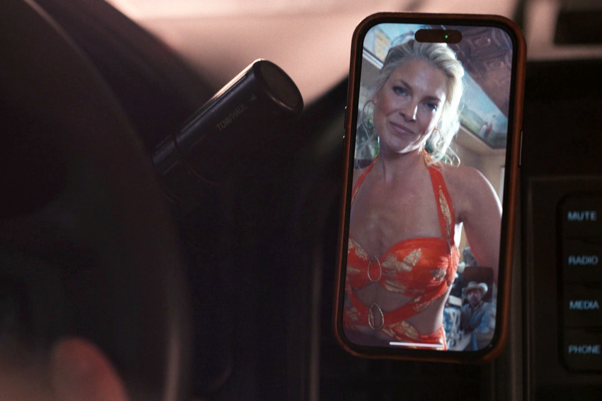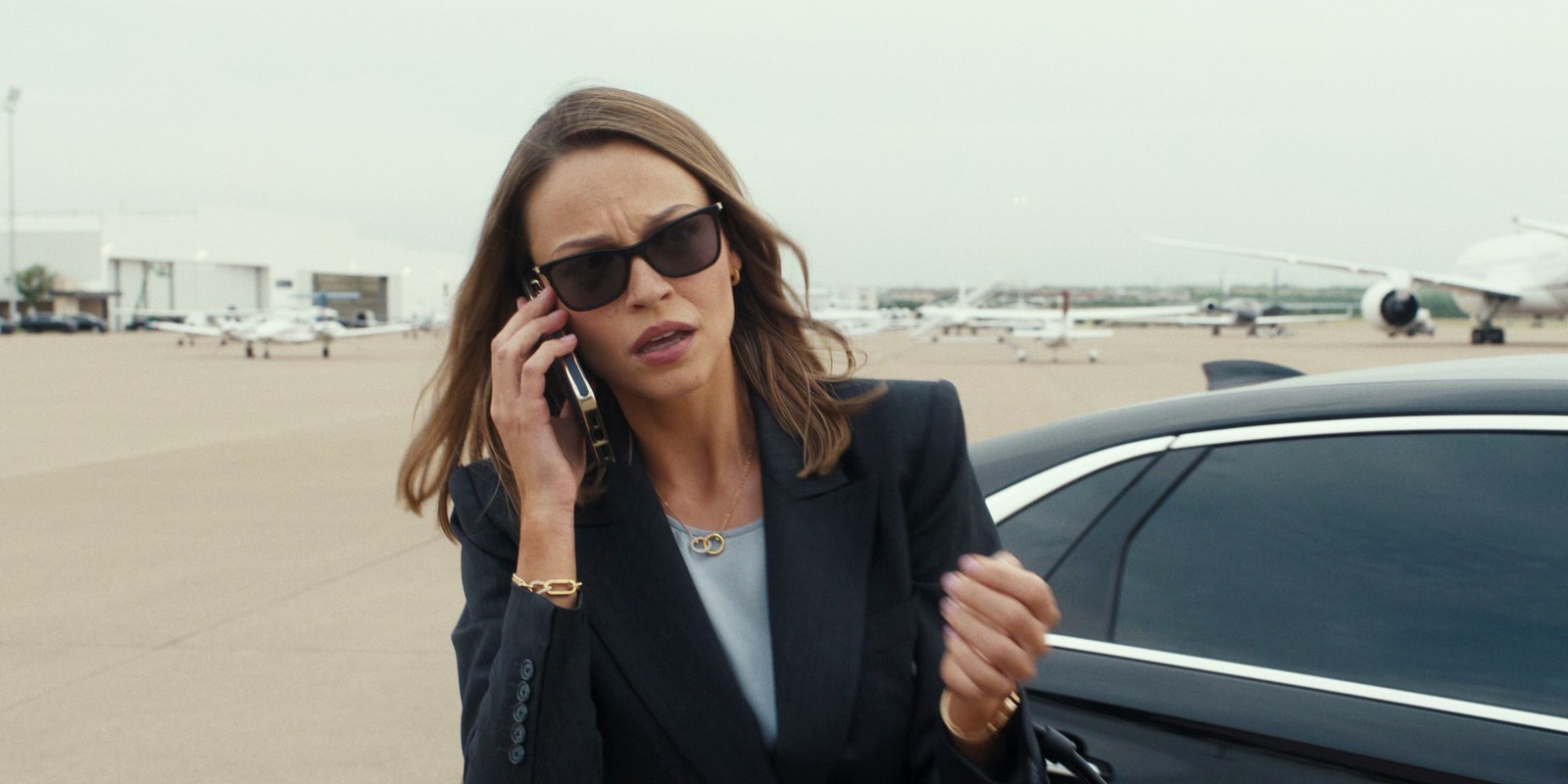 Landman 1×01 – Angela Norris’ orange lace shirt, black and silver crystal buckle belt and diamond cross necklace
