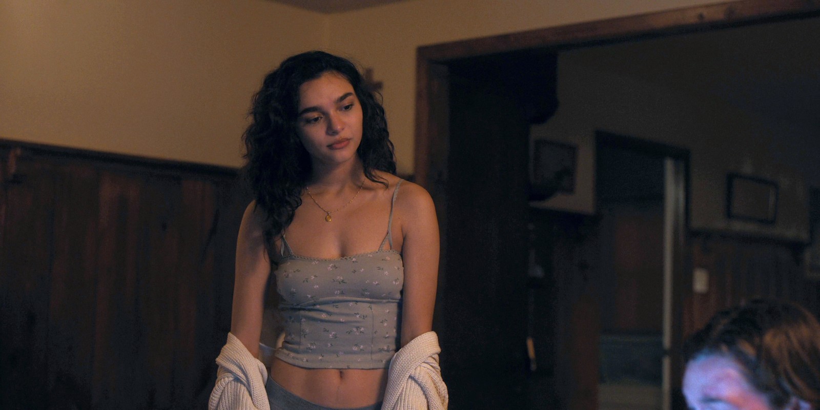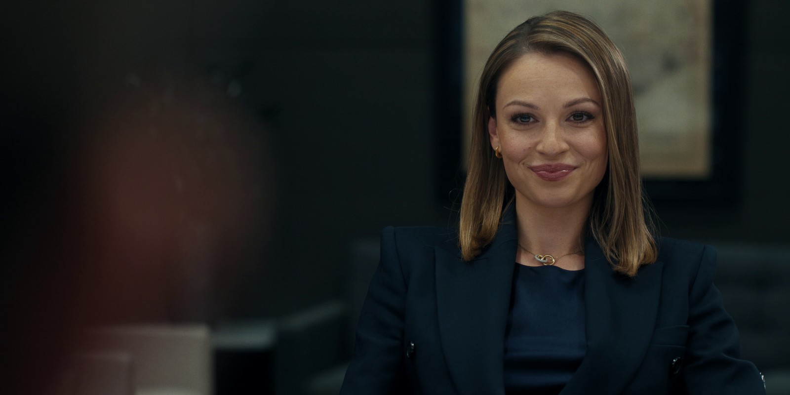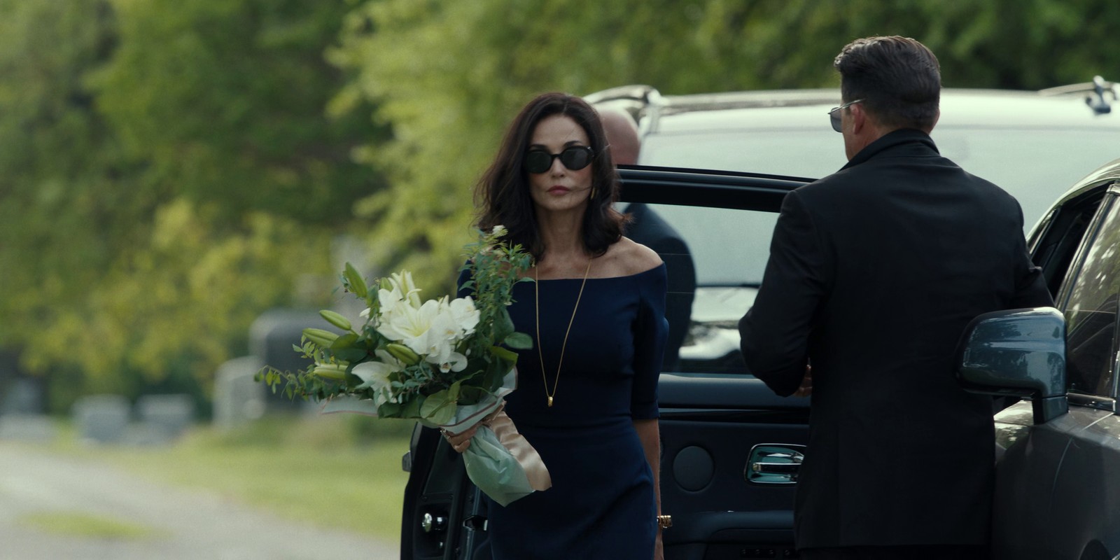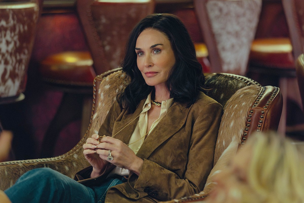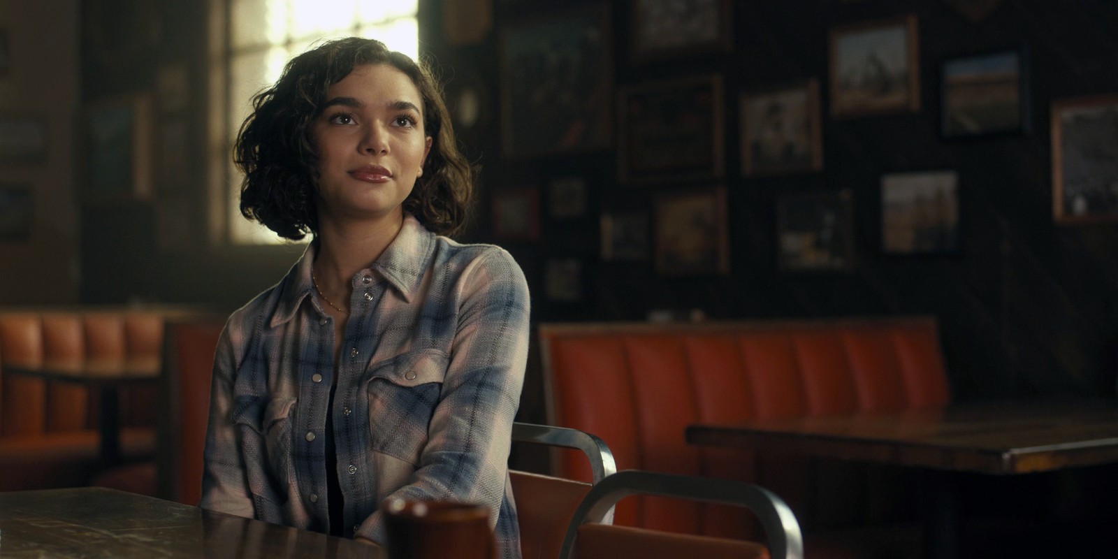 Landman 1×01 – Angela Norris’ orange lace shirt, black and silver crystal buckle belt and diamond cross necklace