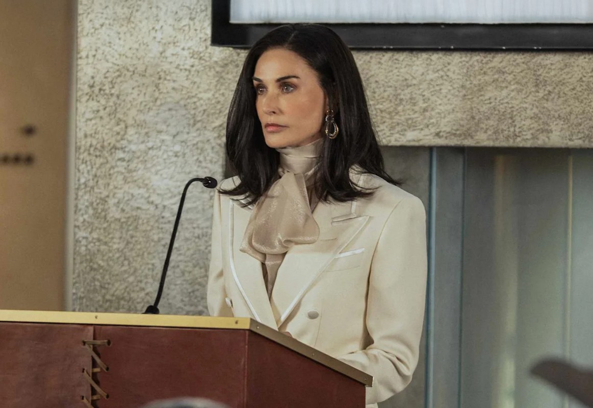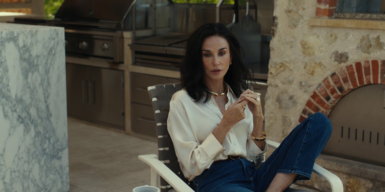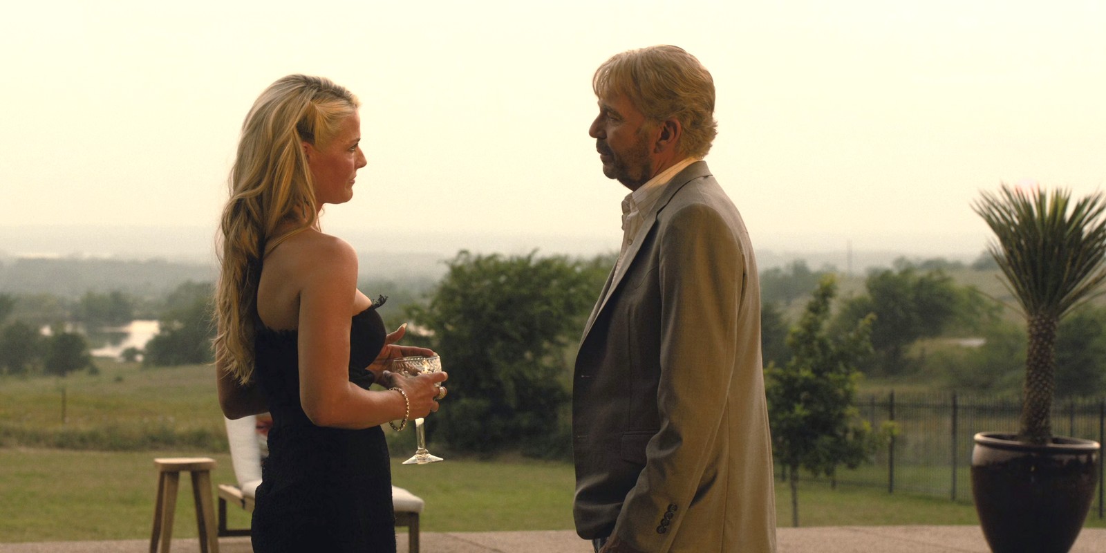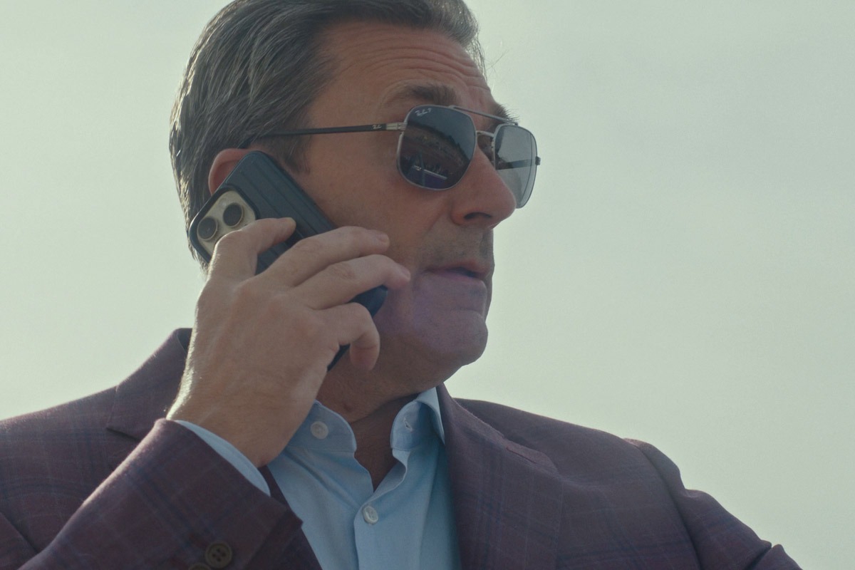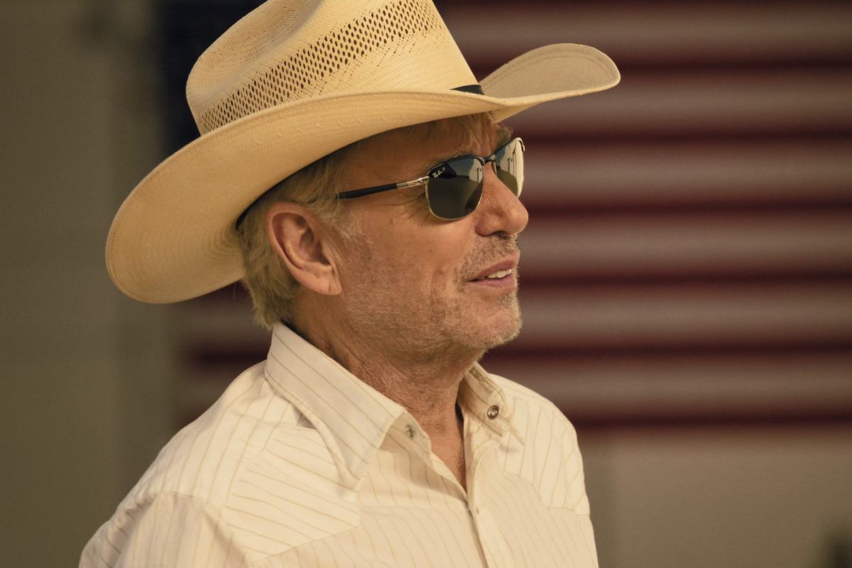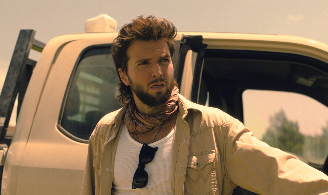 Landman 1×01 – Angela Norris’ orange lace shirt, black and silver crystal buckle belt and diamond cross necklace