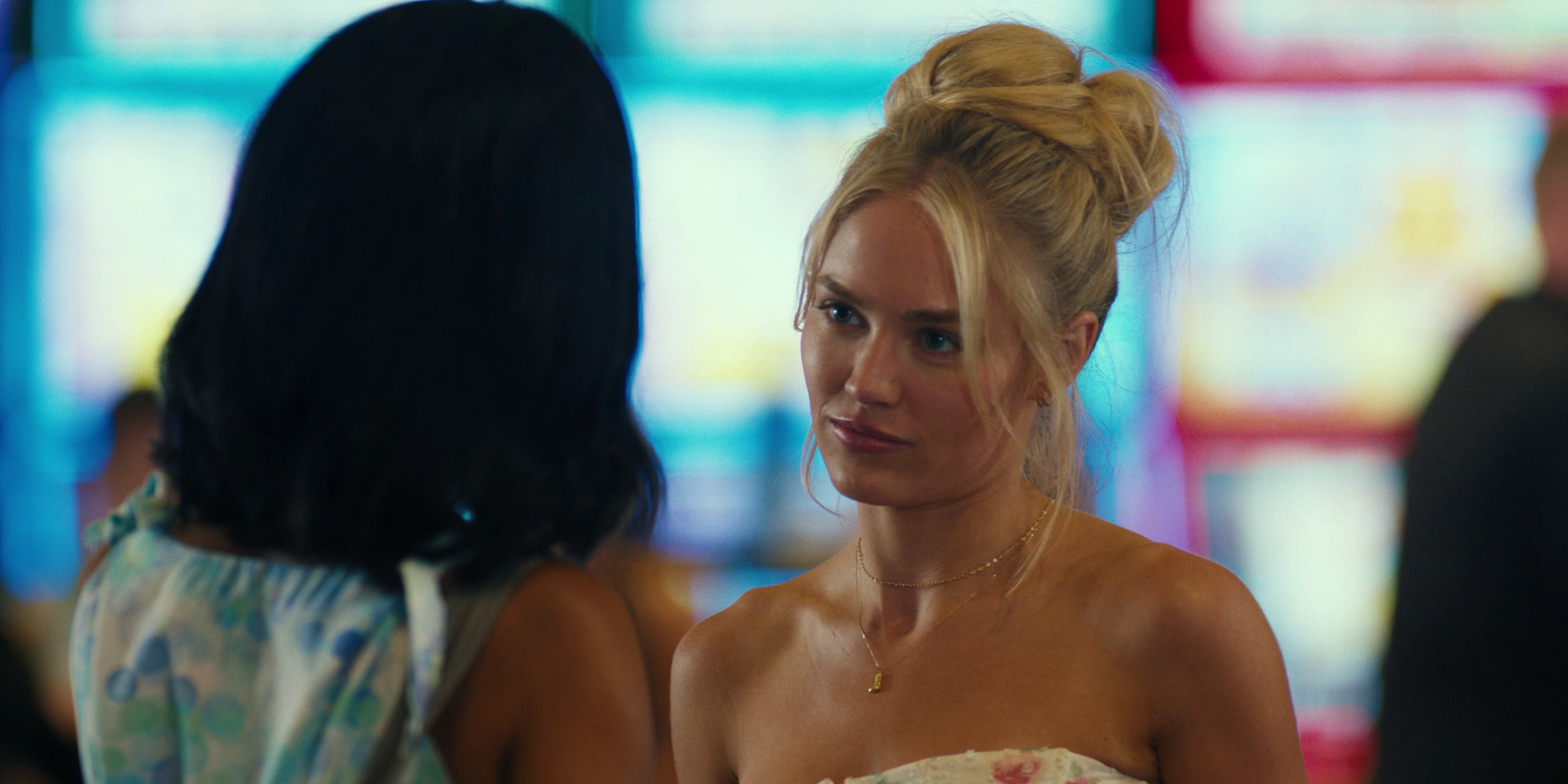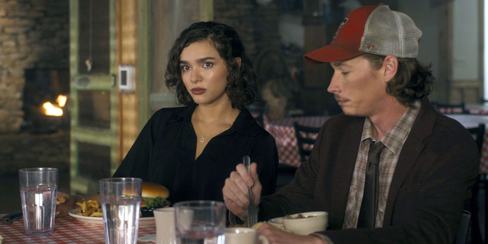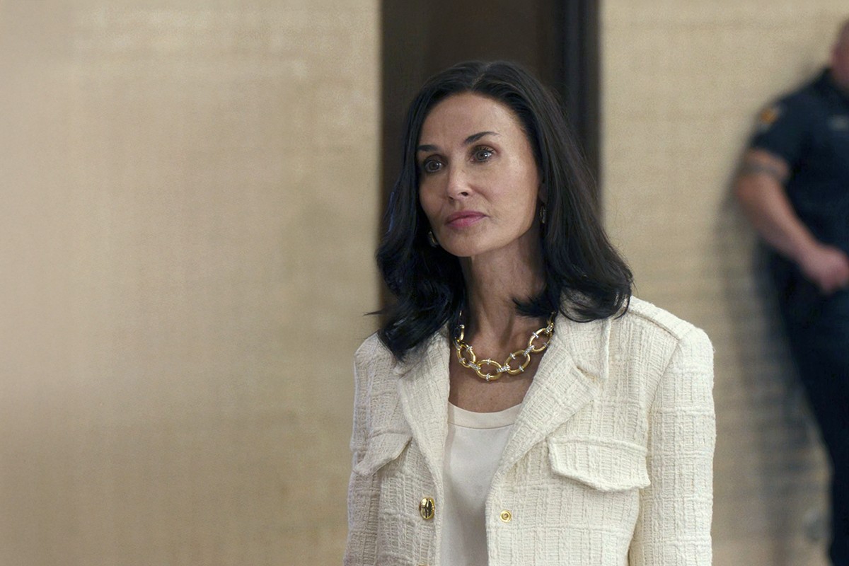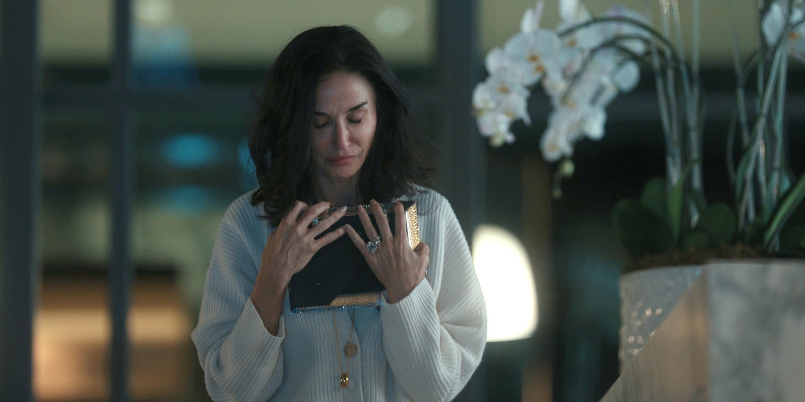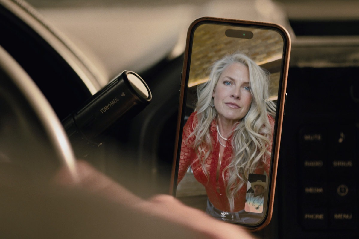 Landman 1×01 – Angela Norris’ orange lace shirt, black and silver crystal buckle belt and diamond cross necklace