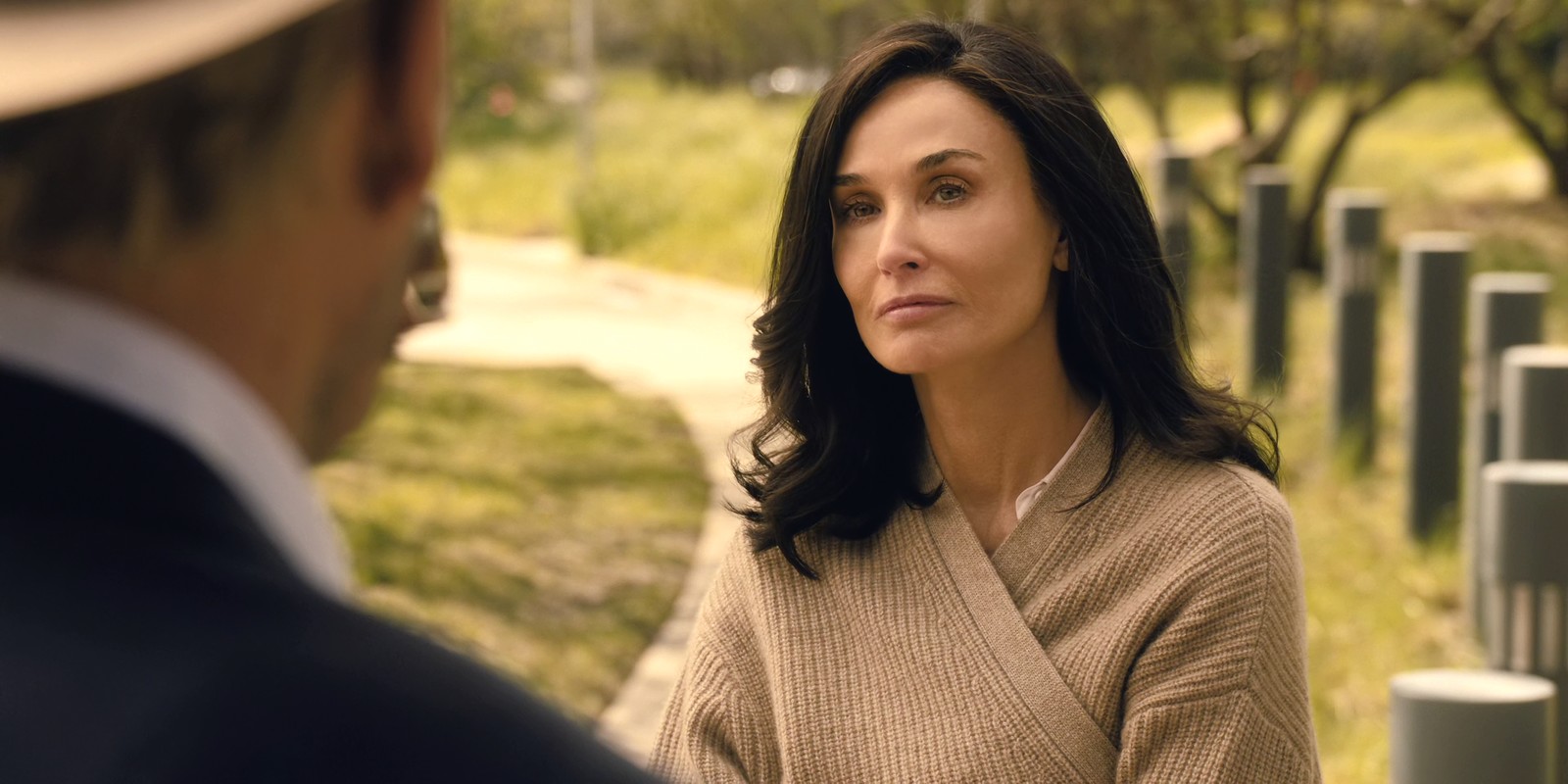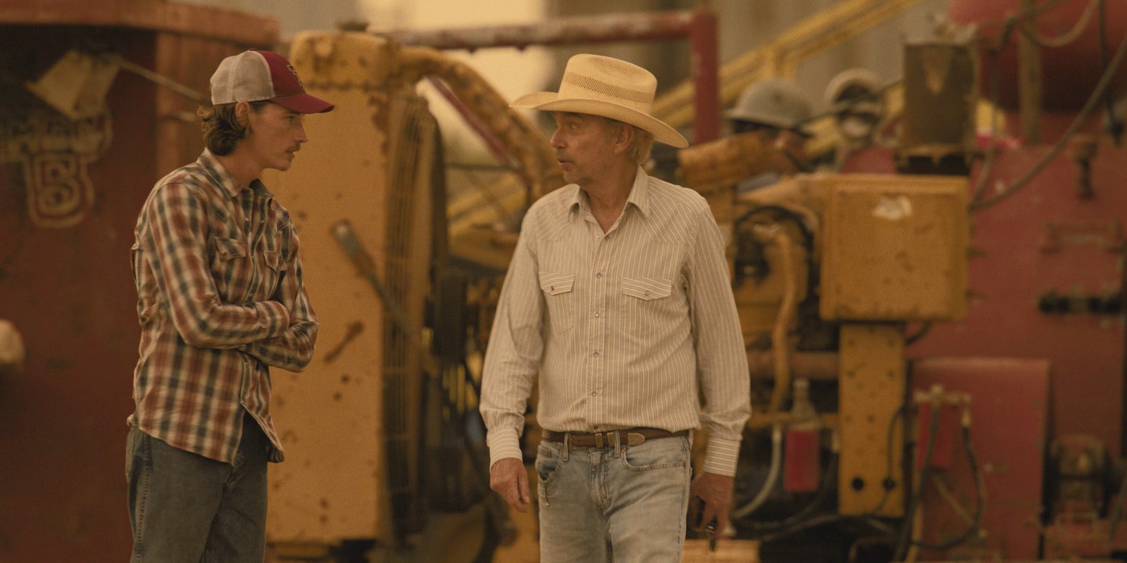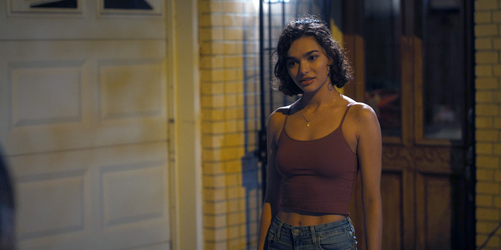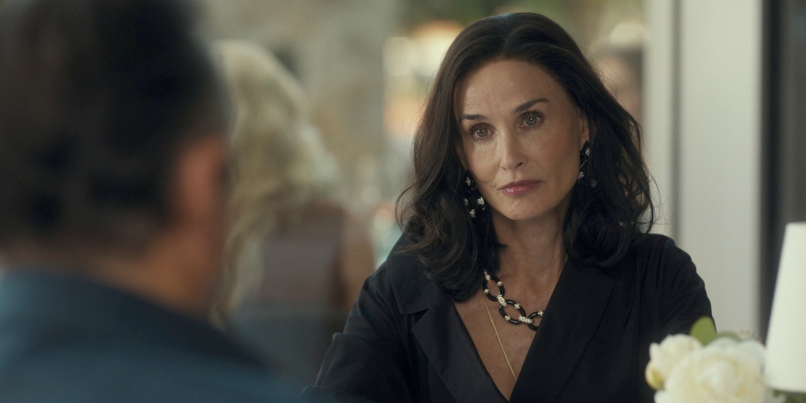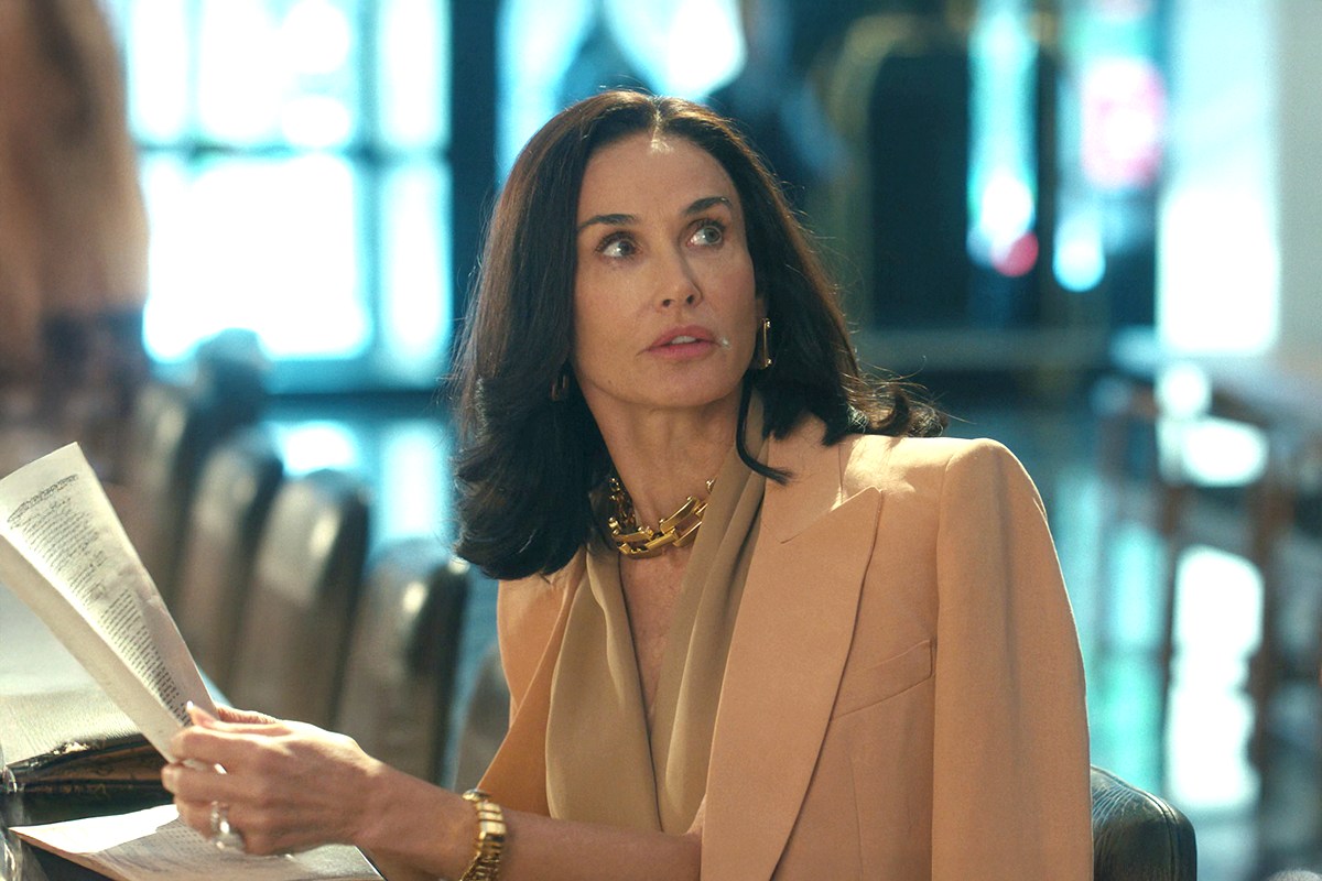 Landman 1×01 – Angela Norris’ orange lace shirt, black and silver crystal buckle belt and diamond cross necklace
