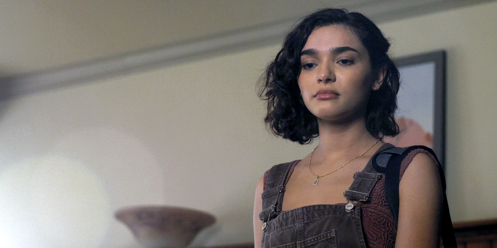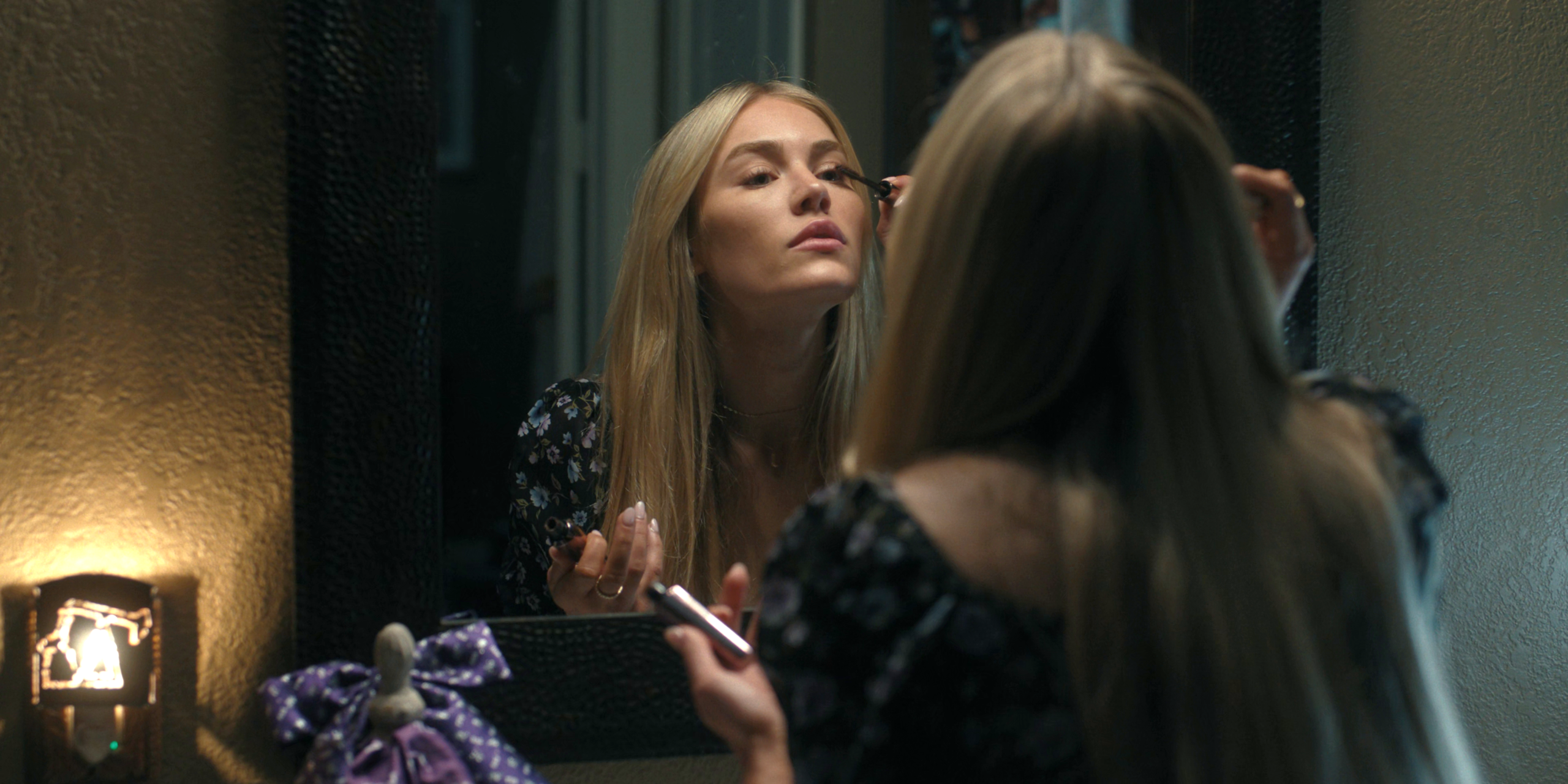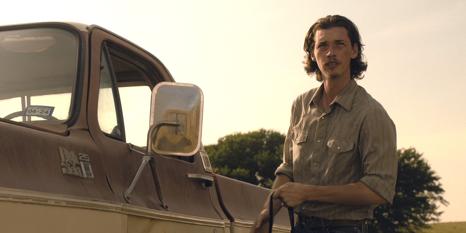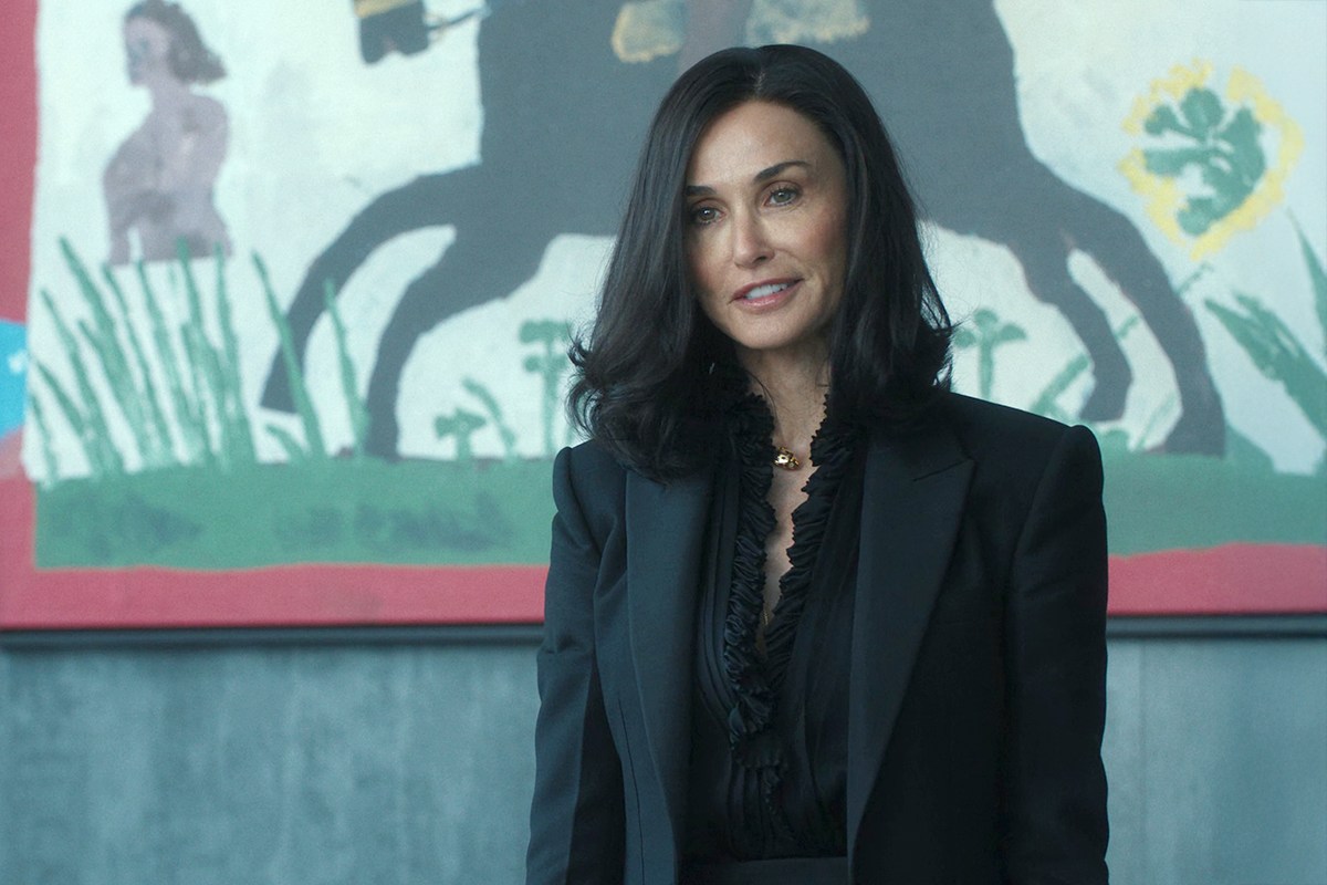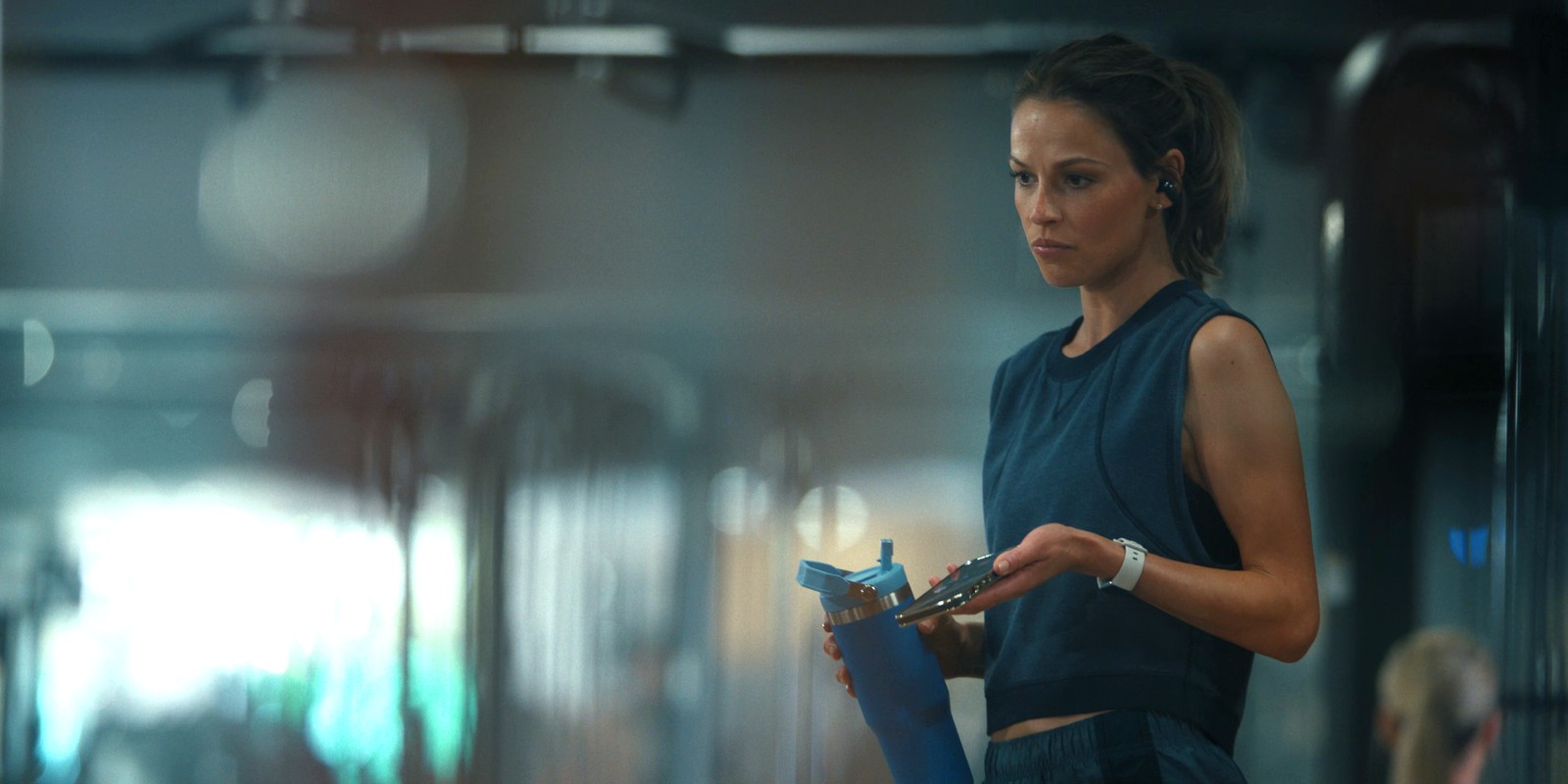 Landman 1×01 – Angela Norris’ orange lace shirt, black and silver crystal buckle belt and diamond cross necklace