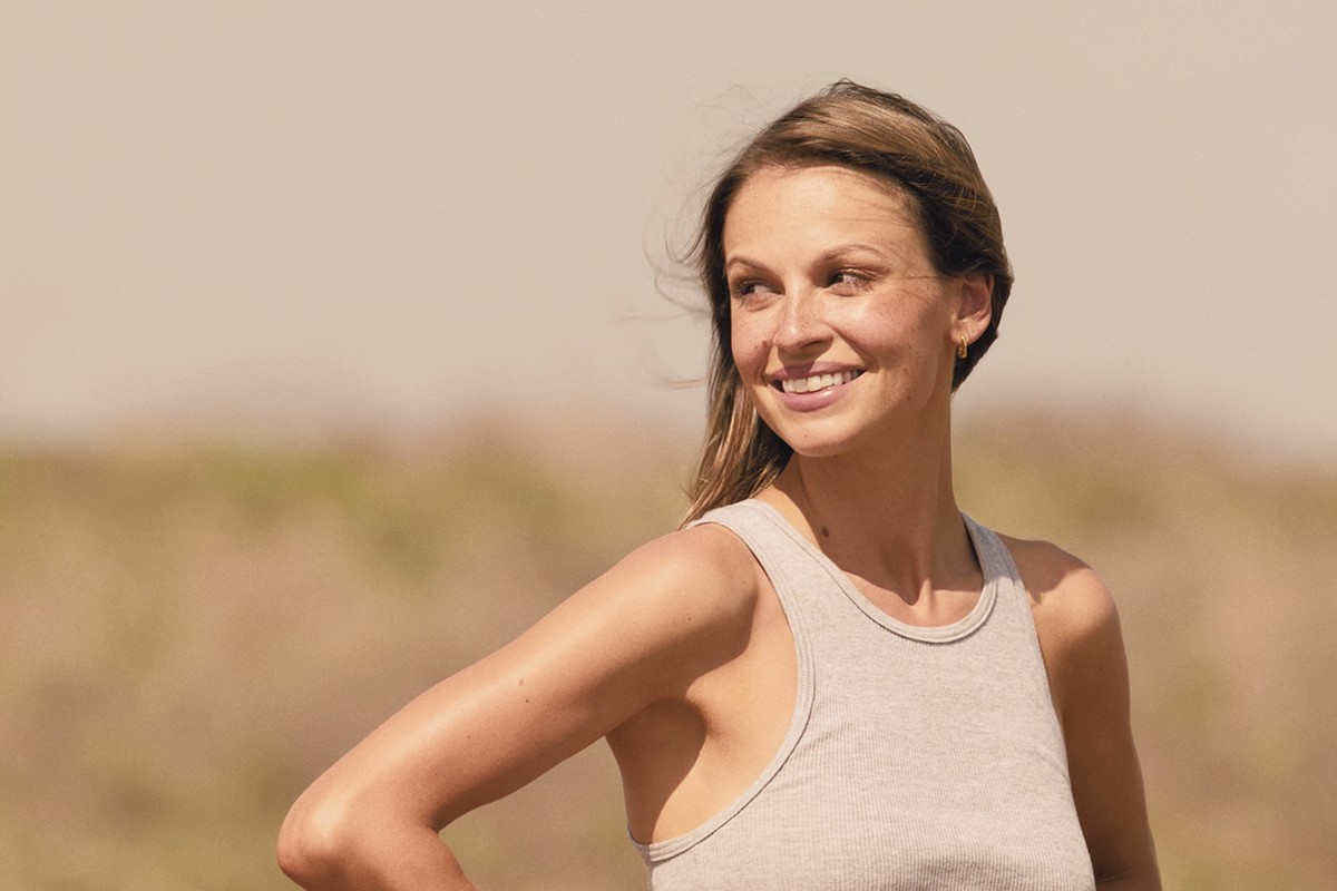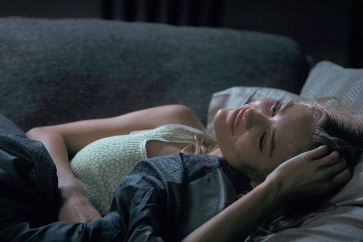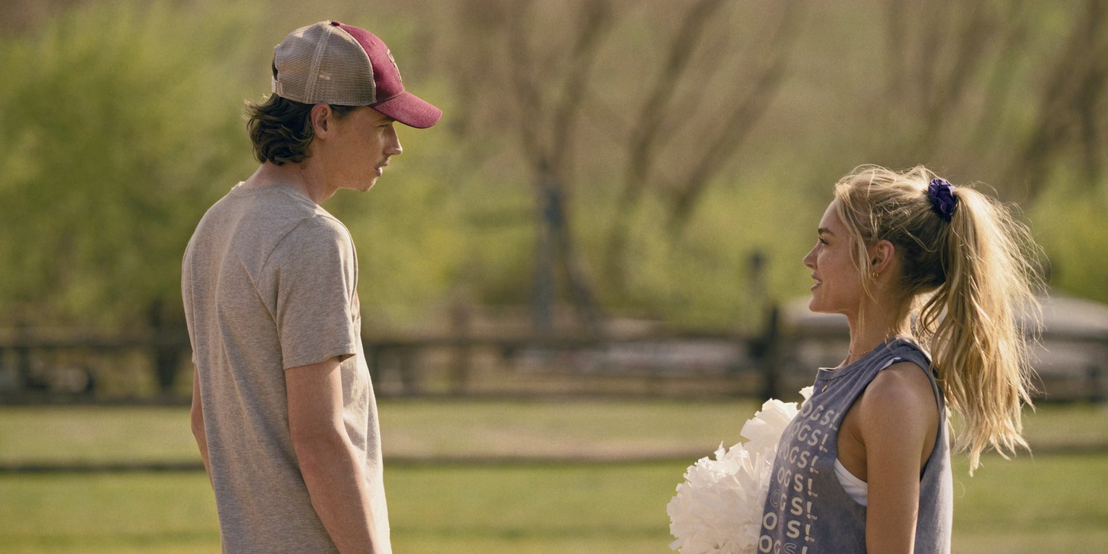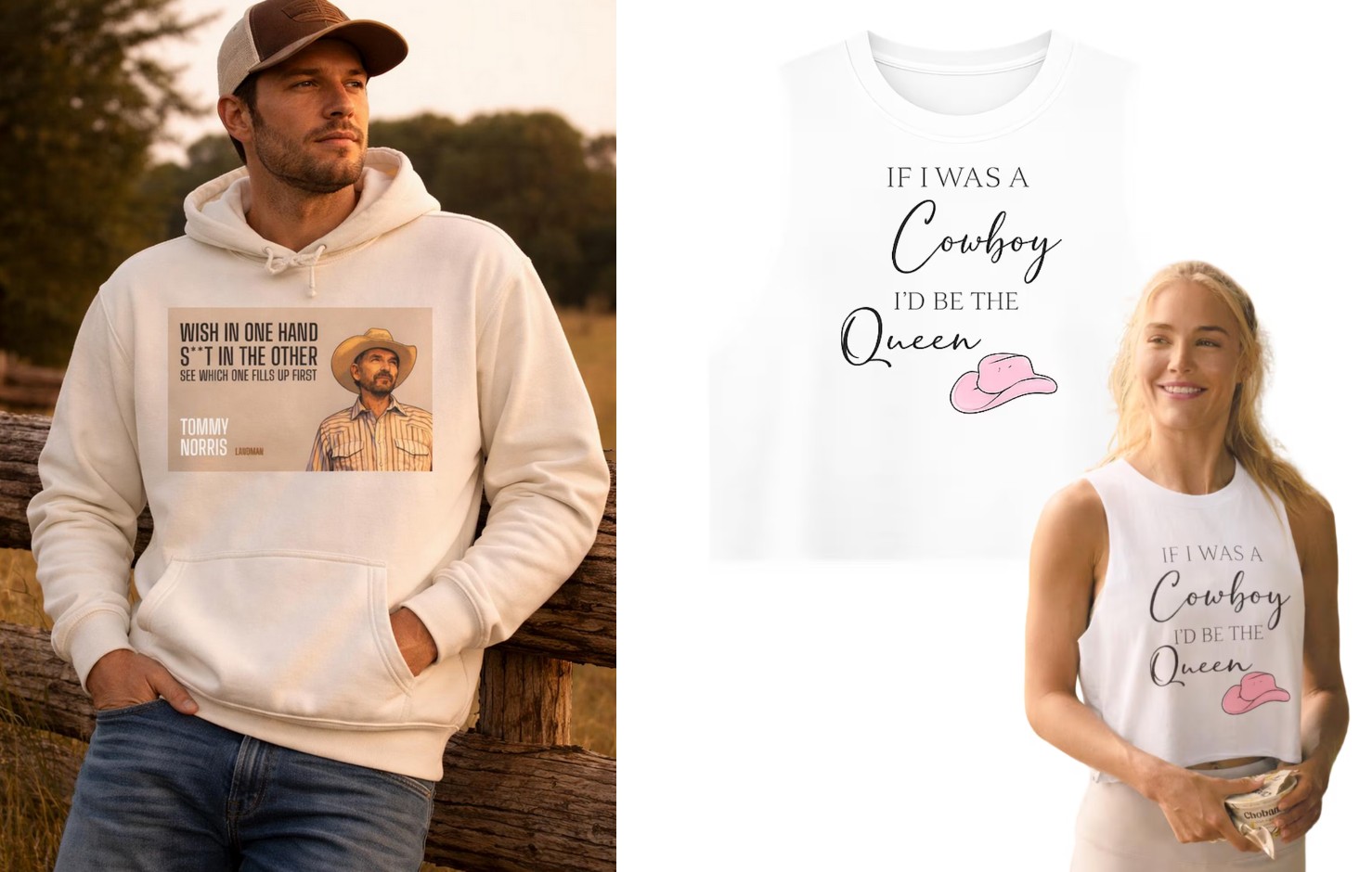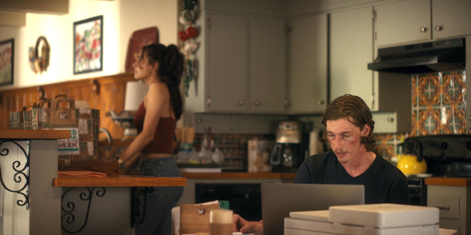 Landman 1×01 – Angela Norris’ orange lace shirt, black and silver crystal buckle belt and diamond cross necklace